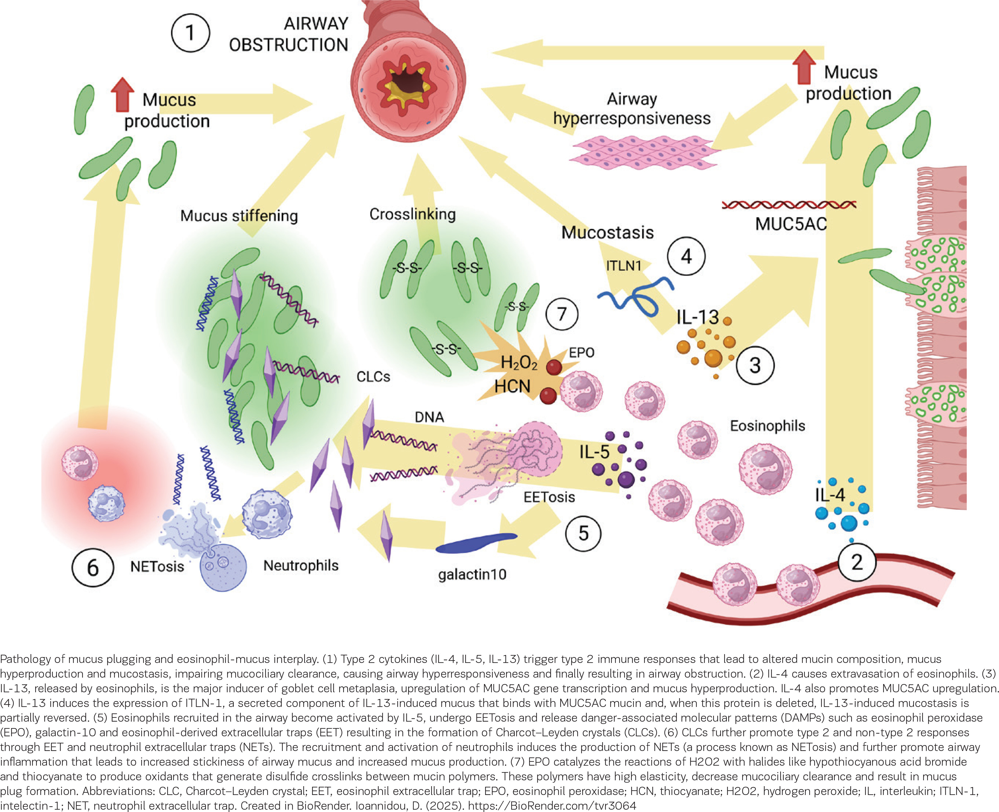 Conversely, altered mucin composition has also been reported to contribute to airway eosinophilic inflammation, indicating a two-way relationship12. Interestingly, an increased MUC5AC:MUC5B ratio was correlated with sputum eosinophilia among asthma patients17. A possible mechanism is reduced eosinophilic apoptosis since Singlec-F (a pro-apoptotic surface protein specifically expressed on mouse eosinophils) is described to interact with glycoepitopes in the MUC5B and induce their death in animal studies27. A direct role of IL-13 in mucin gene expression and upregulation is also well described 14,28. The pathophysiological mechanisms leading to mucus plugging and the contribution of eosinophils to altered airway mucus are briefly illustrated in Figure 1.
