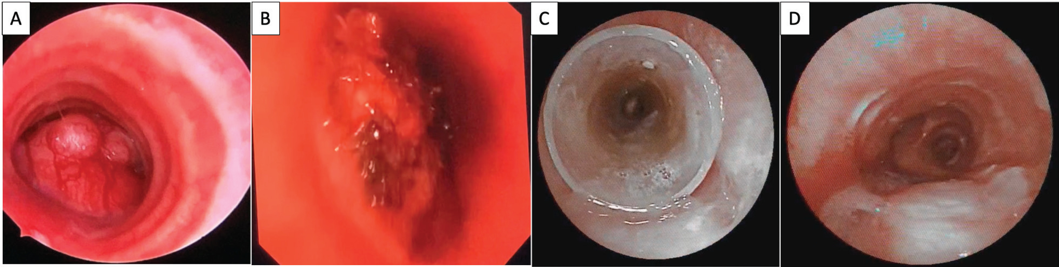 Bronchoscopy imaging before and after stent placement in tracheal spindle cell sarcoma: A) Bronchoscopy revealed a large, hypervascular tumor obstructing nearly the entire tracheal lumen; B) Bronchoscopy after mass removal using a rigid scope and laser application showed a residual mass obstructing the trachea; C) A silicone stent was placed to maintain airway patency; D) Bronchoscopy after stent removal showed good airway patency