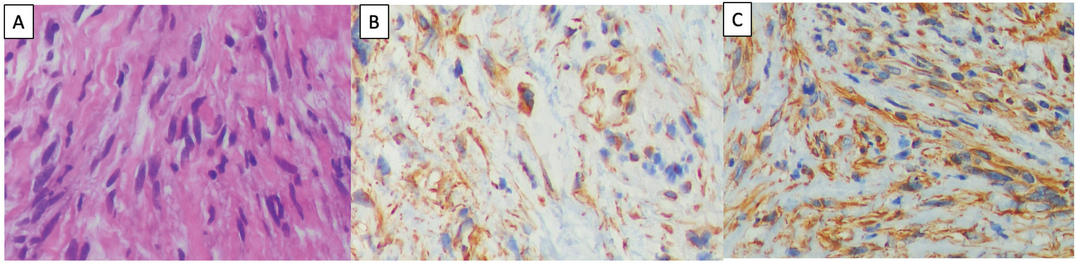 Histologic and immunohistochemical features of spindle cell sarcoma: A) Hematoxylin-eosin staining showing cellular haphazardly arranged spindle cell proliferation with prominent stromal hyaline collagen bands (×400); B) Immunohistochemistry showing positive S100 (×400); C) Immunohistochemistry showing positive vimentin (×400)