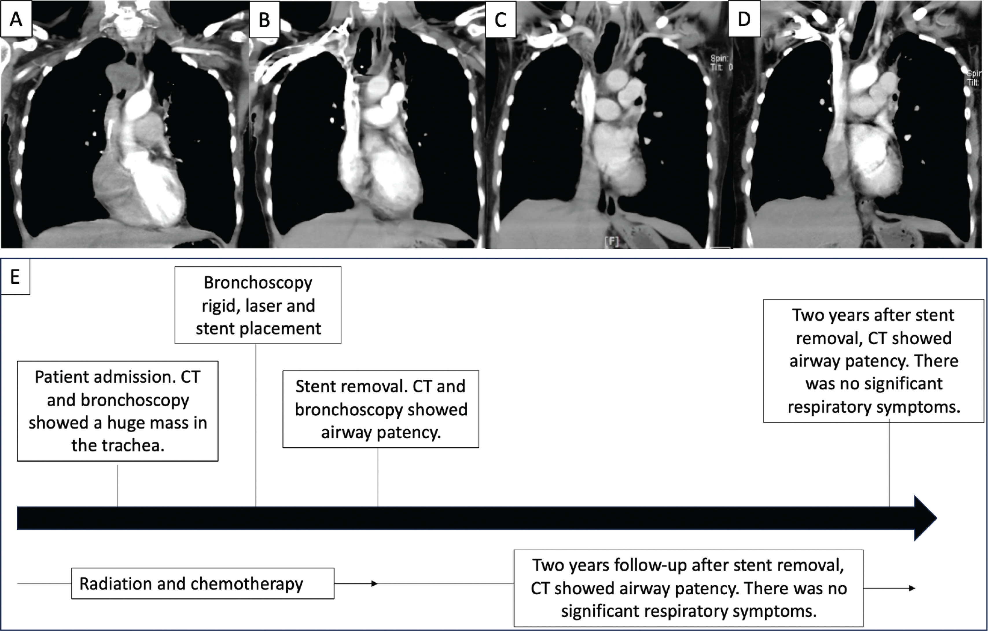 Chest CT images and timeline of treatment: A) Coronal view of the mediastinal window showing a mass in the middle trachea; B) After laser and rigid bronchoscopy mass removal, a coronal view of the mediastinal window shows an open airway with stent (red box); C) After chemoradiation and stent removal, a coronal view of the mediastinal window shows airway patency; D) Two years after chemoradiation and stent removal, a coronal view of the mediastinal window showed airway patency; E) Timeline of treatment